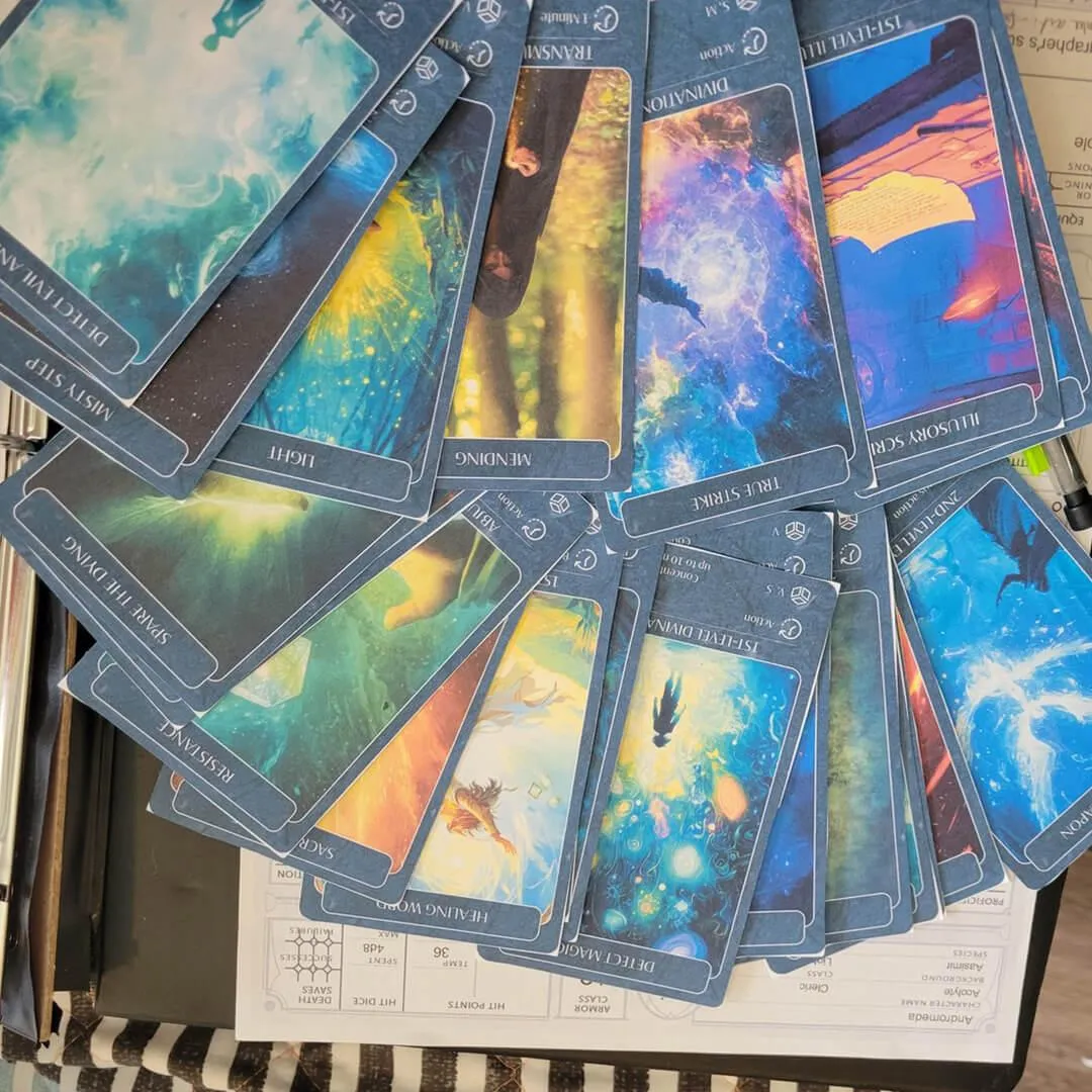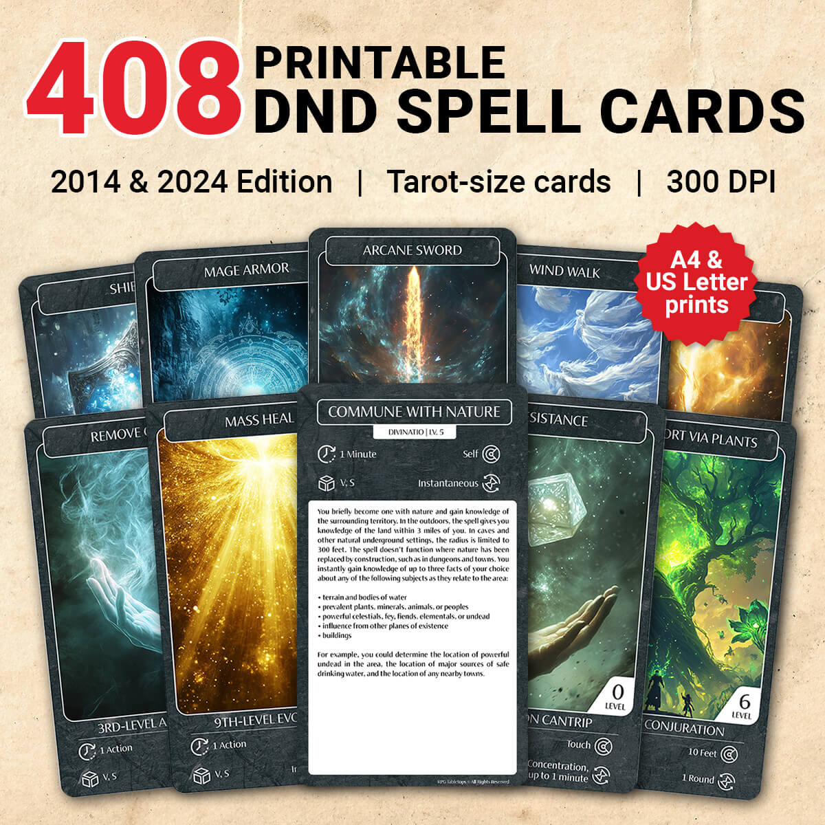 Clear details. Tarot size. 300 DPI. A4 and Letter size. From cantrips to 9th-level spells.