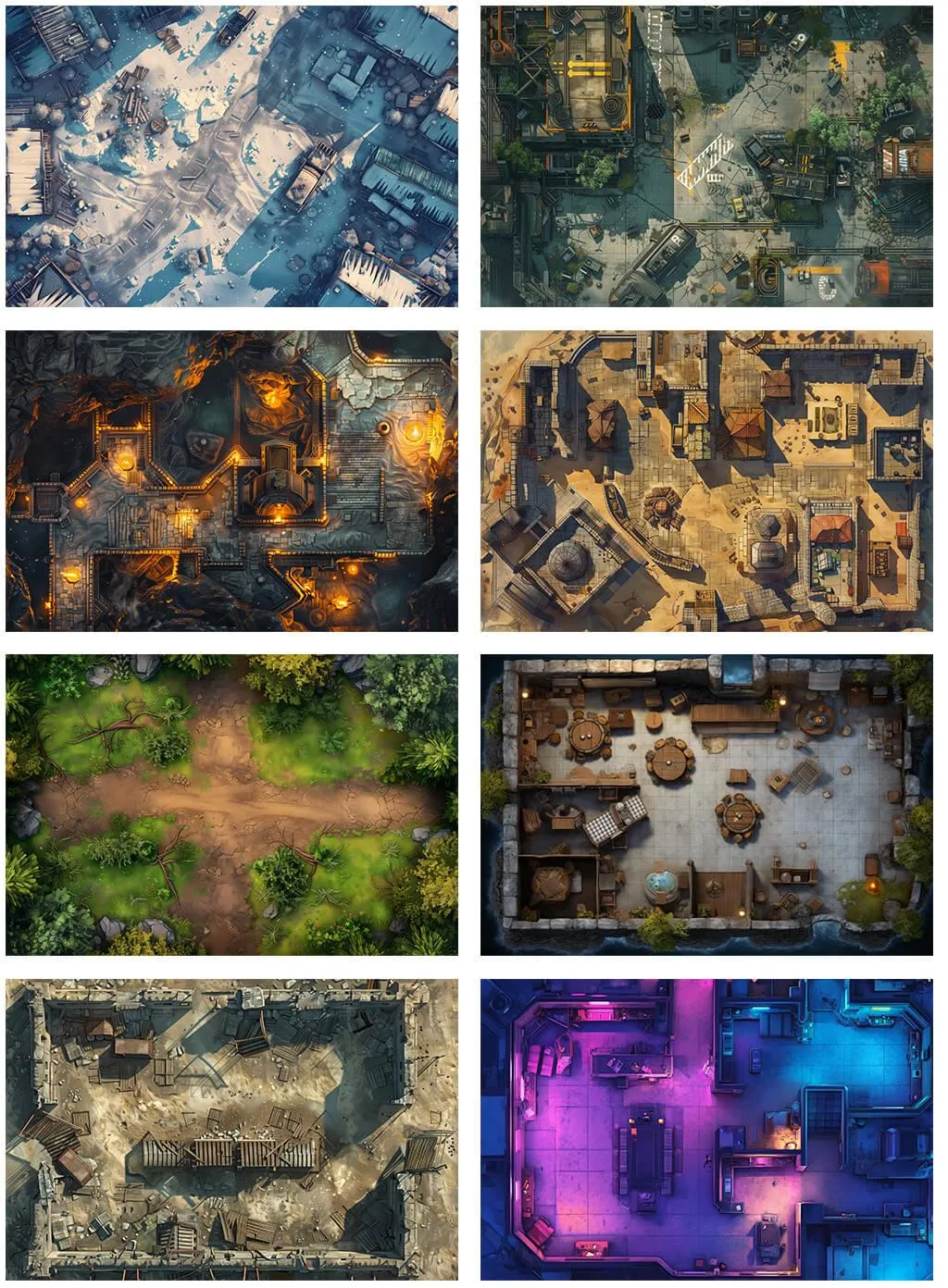 You'll discover a wide range of maps, including top-down, isometric, gridded, and printable maps, all upscaled for better image quality. Plus, we offer a great variety of landscapes, locations, and thematic packages to cover any scenario you can imagine.